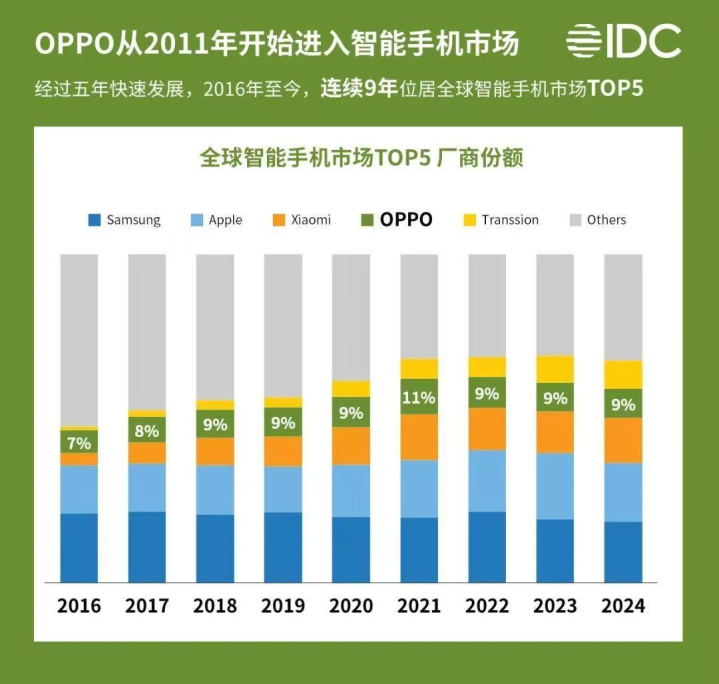 众所周知,全球智能手机市场已经进入竞争白热化阶段,各大手机厂商各显神通,给广大消费者带来了不少优秀产品。其中,OPPO作为国产知名头部厂商,一直保持稳扎稳打的发展策略,在技术创新、产品研发等方面都积累深厚,并且已经凭借自身实力在国际市场占据了重要的一席之地。根据IDC给出的数据,自从2011年进入手机市场以来,OPPO已经连续九年取得全球智能手机市场前五的成绩,在2024年更是一举夺得第四的宝座。