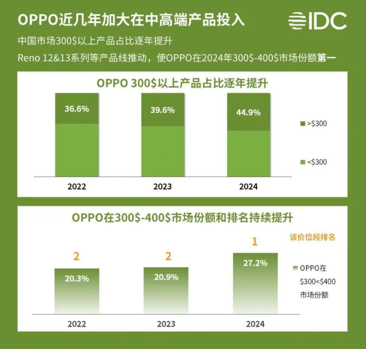 多年来,OPPO为广大消费者带来了一代又一代亮眼产品,从高端旗舰到性价比机型都是看点满满。在中高端市场上,OPPO也表现出稳中向好的成绩。根据国际知名数据公司IDC的报告,在 2024 年第四季度中 300 美元至 400 美元这个价格区间里,OPPO凭借OPPO Reno12、OPPO Reno13系列等产品线推动,成为该细分市场的领导者,市场份额达到了 27.2%。
